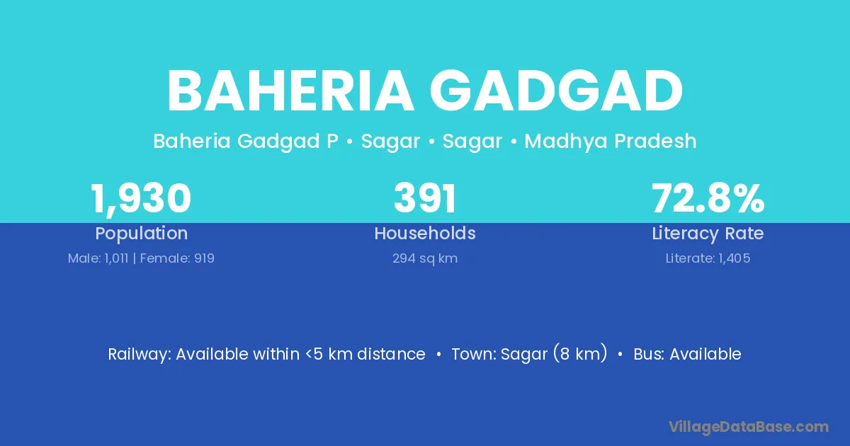 Sagar (8 km) is the nearest town to Baheria Gadgad village for major economic activities and is located approximately 8 km away.
