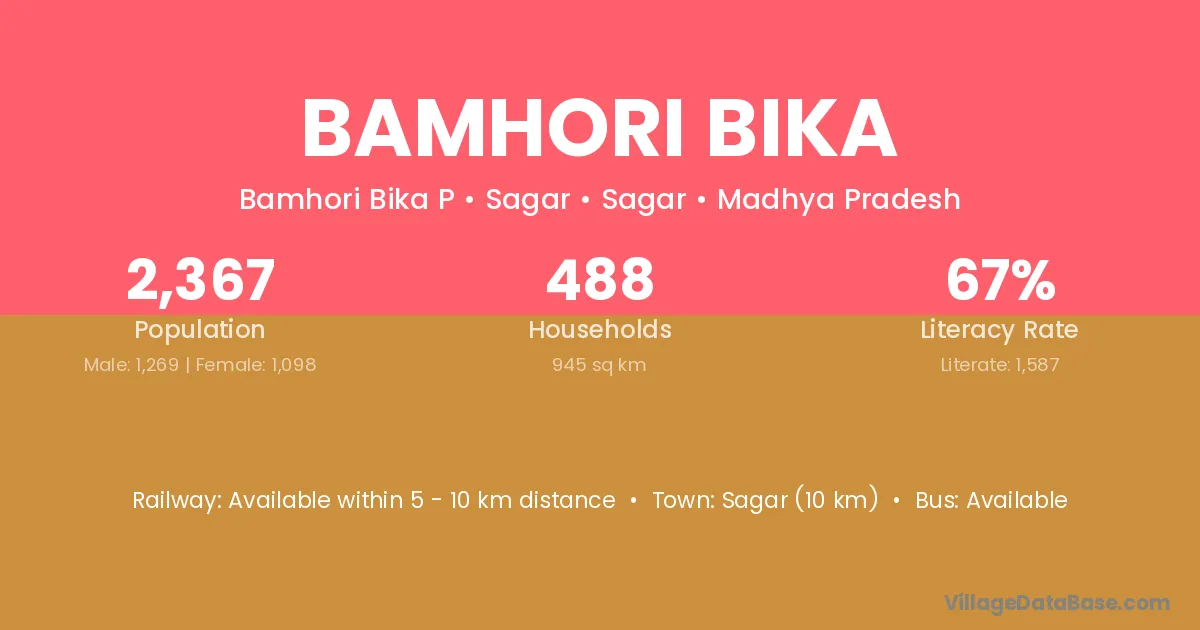Sagar (10 km) is the nearest town to Bamhori Bika village for major economic activities and is located approximately 10 km away.