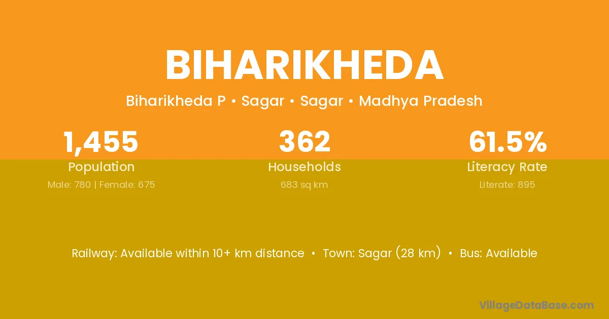 Sagar (28 km) is the nearest town to Biharikheda village for major economic activities and is located approximately 28 km away.
