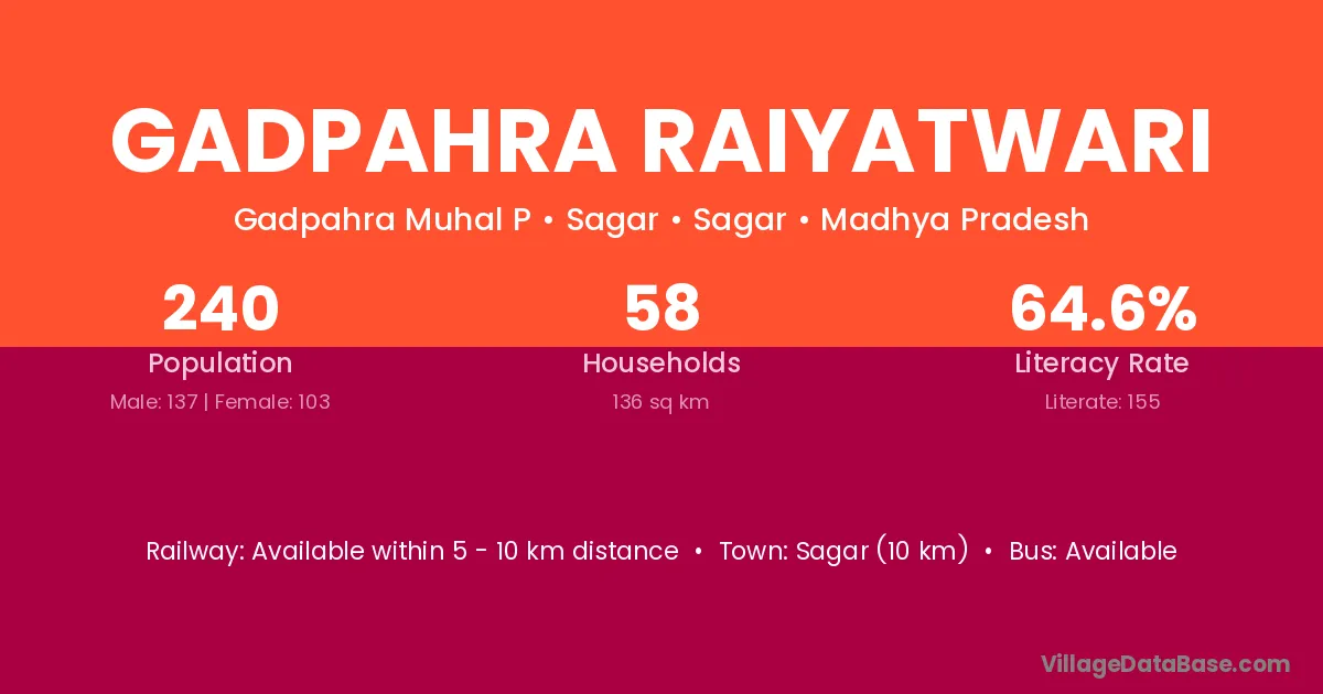 Sagar (10 km) is the nearest town to Gadpahra Raiyatwari village for major economic activities and is located approximately 10 km away.