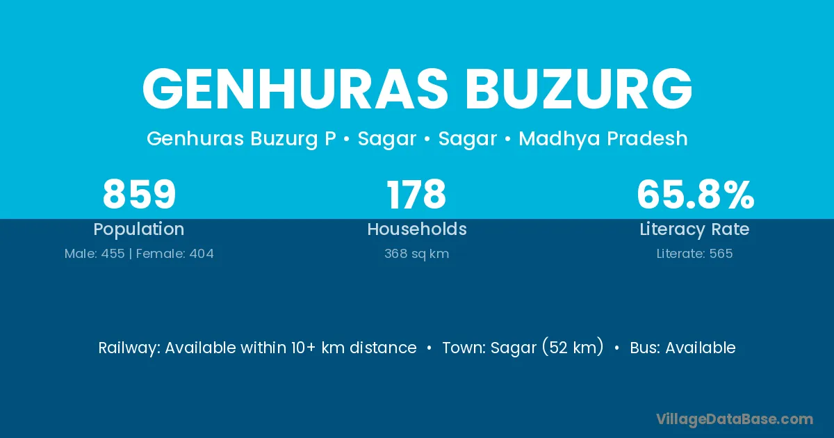 Sagar (52 km) is the nearest town to Genhuras Buzurg village for major economic activities and is located approximately 52 km away.