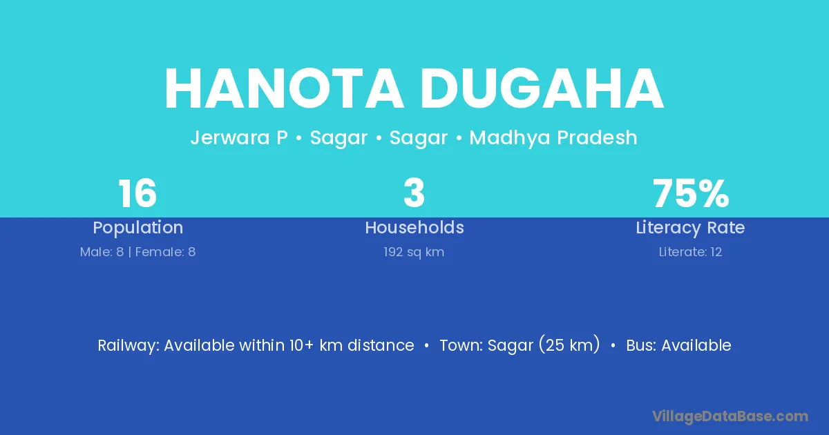 Sagar (25 km) is the nearest town to Hanota Dugaha village for major economic activities and is located approximately 25 km away.