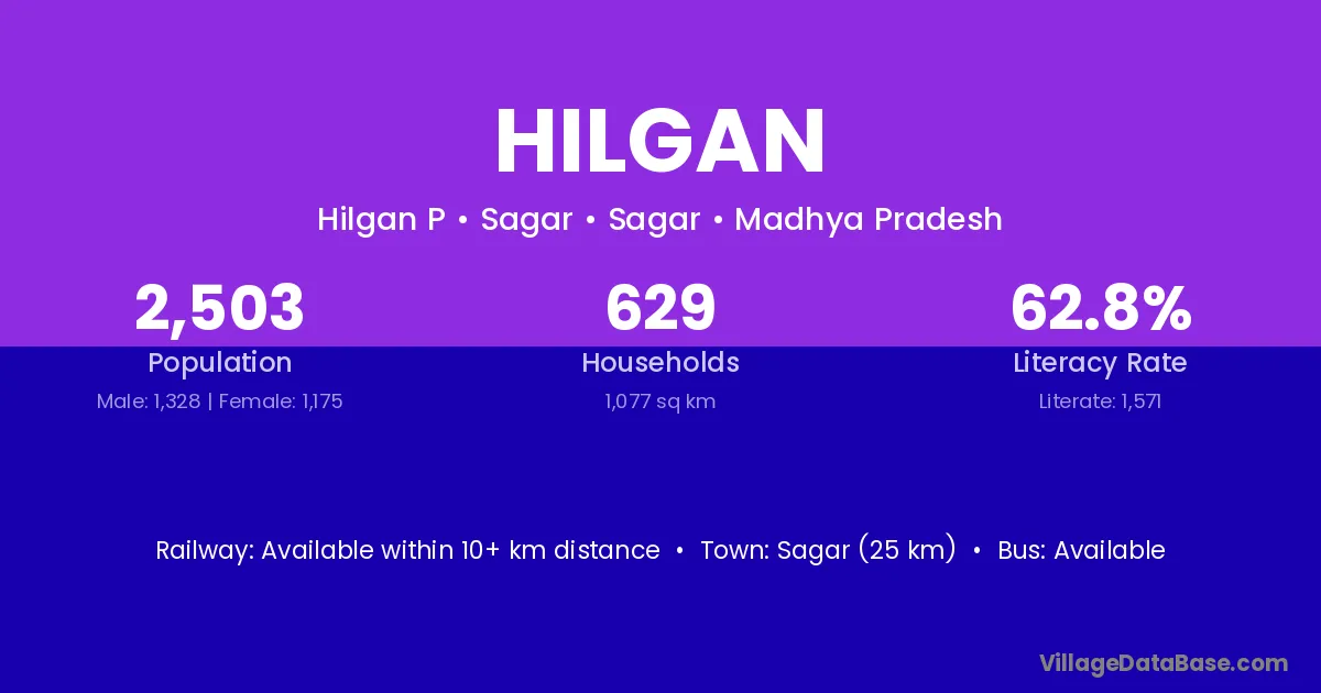 Sagar (25 km) is the nearest town to Hilgan village for major economic activities and is located approximately 25 km away.