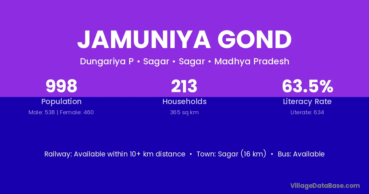 Sagar (16 km) is the nearest town to Jamuniya Gond village for major economic activities and is located approximately 16 km away.