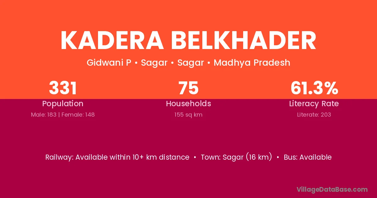 Sagar (16 km) is the nearest town to Kadera Belkhader village for major economic activities and is located approximately 16 km away.