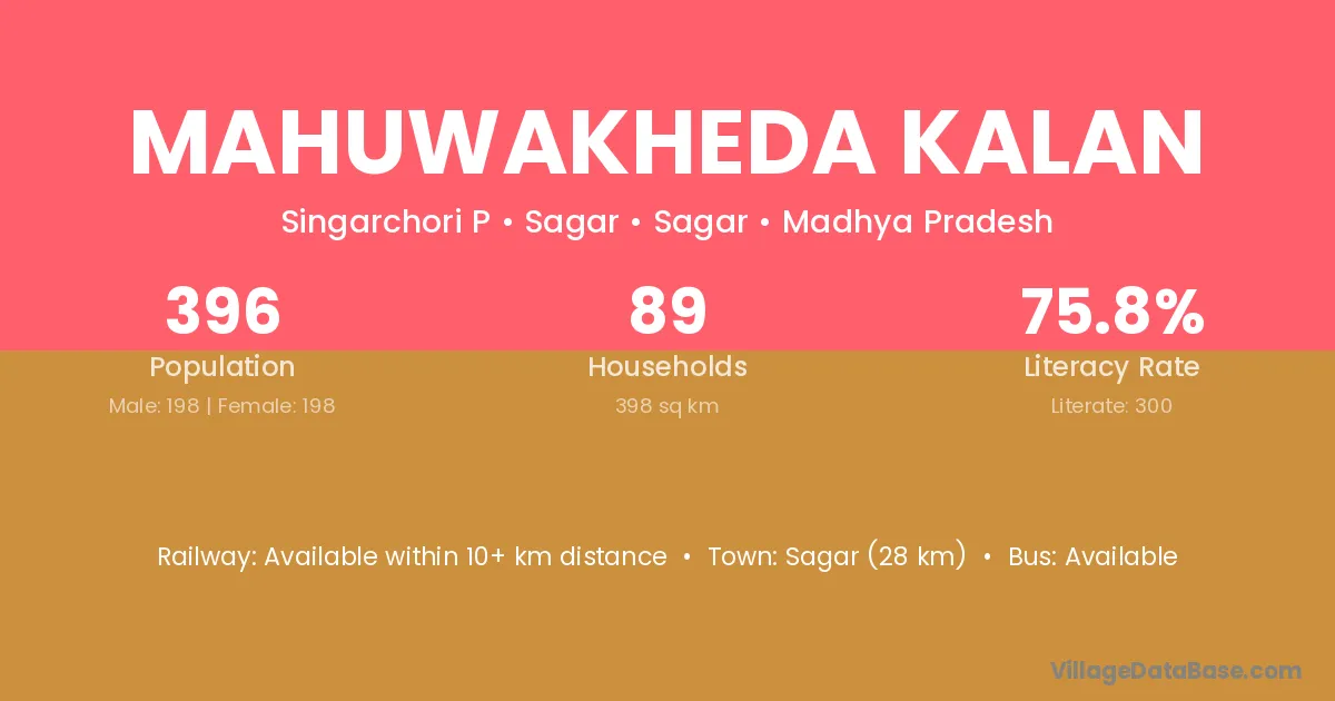 Mahuwakheda Kalan village has a total population of 396 people, of which 198 are males and 198 are females.