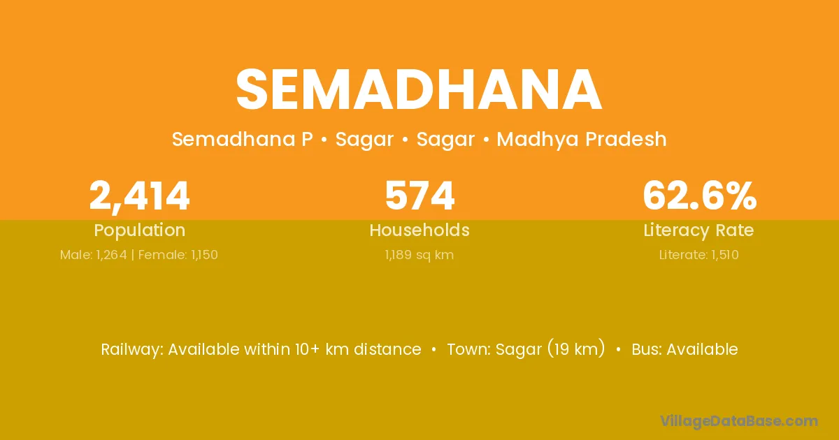 Sagar (19 km) is the nearest town to Semadhana village for major economic activities and is located approximately 19 km away.