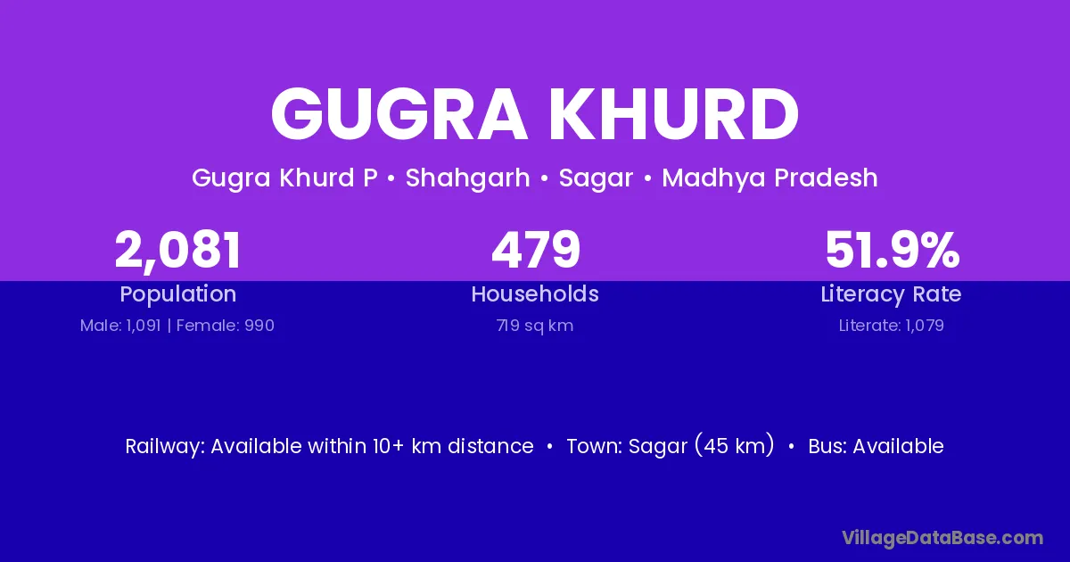 Sagar (45 km) is the nearest town to Gugra Khurd village for major economic activities and is located approximately 45 km away.