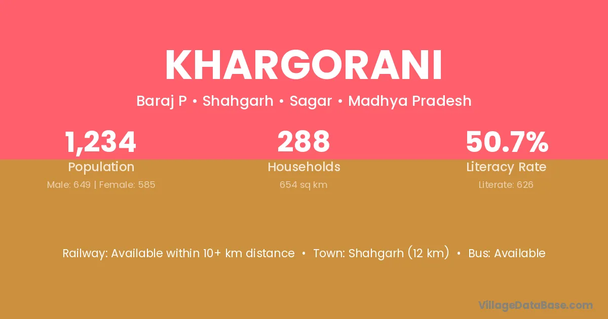 Shahgarh (12 km) is the nearest town to Khargorani village for major economic activities and is located approximately 12 km away.
