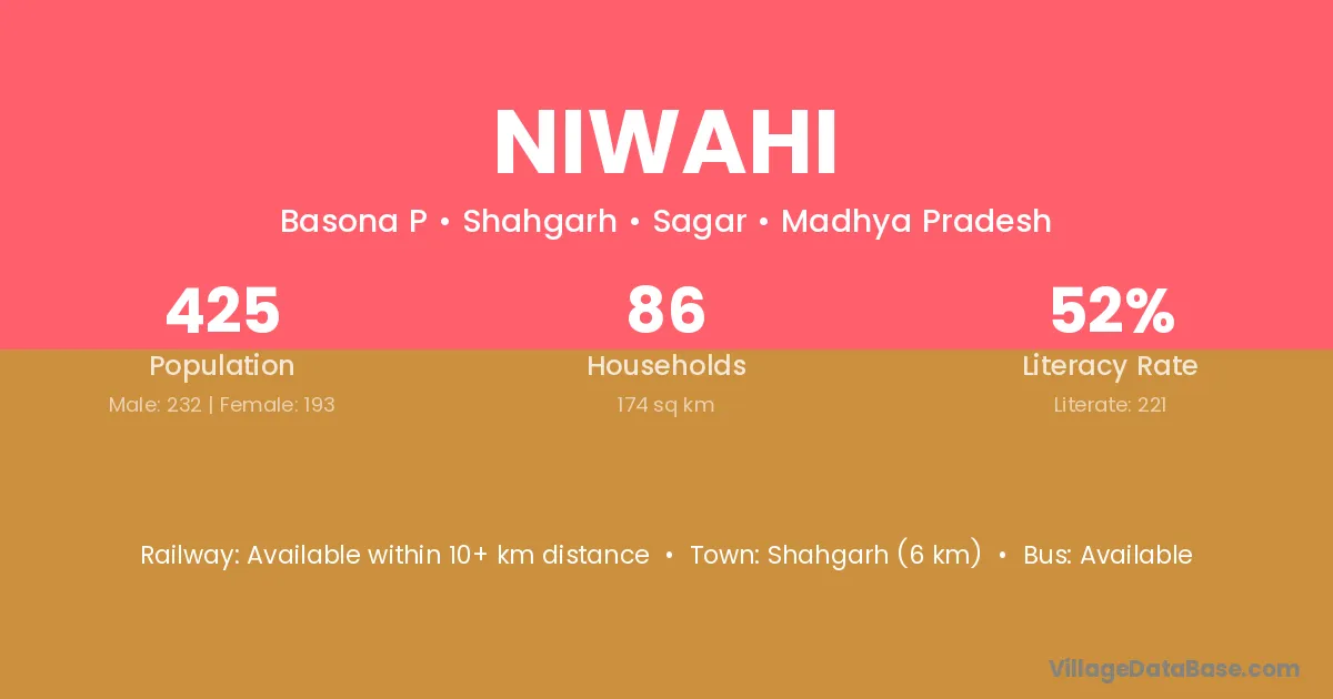 Shahgarh (6 km) is the nearest town to Niwahi village for major economic activities and is located approximately 6 km away.
