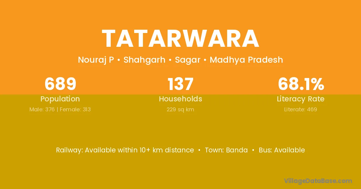 Tatarwara village has a total population of 689 people, of which 376 are males and 313 are females.