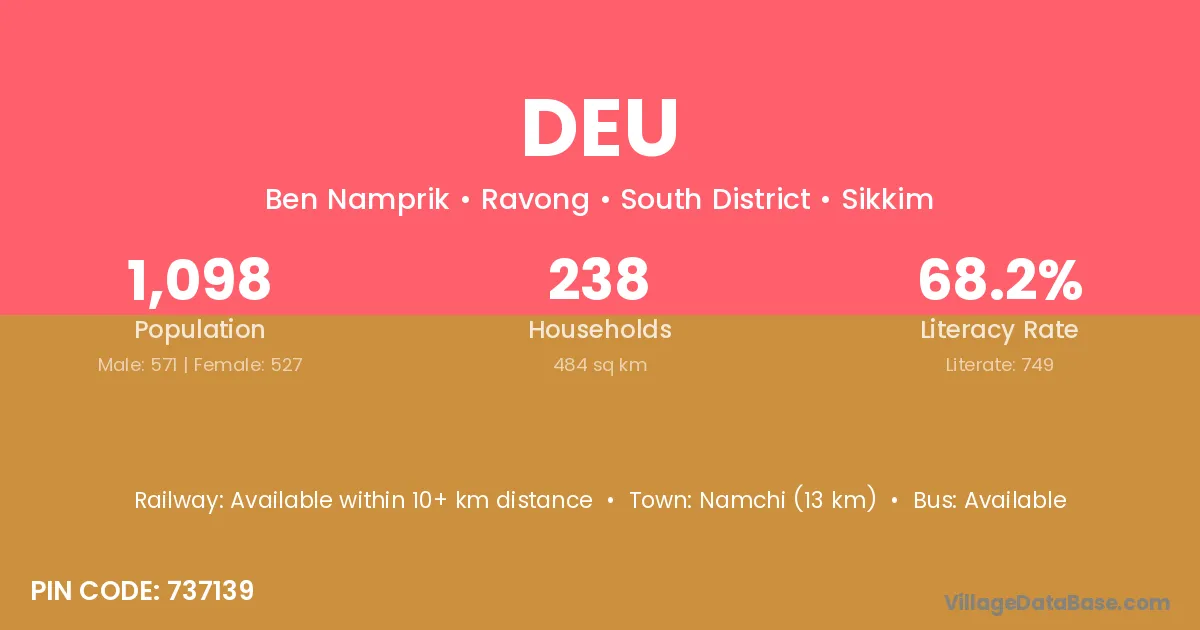 The literacy rate of Deu village is 57.29%. Male literacy stands at 65.41% and female literacy at 48.57%.