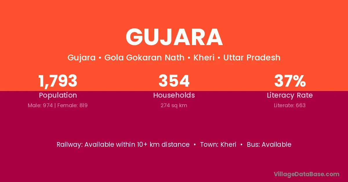 The literacy rate of Gujara village is 58.37%. Male literacy stands at 69.57% and female literacy at 46.23%.