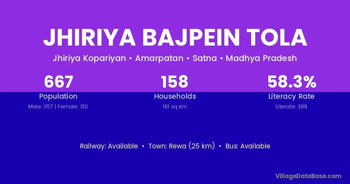 Rewa (25 km) is the nearest town to Jhiriya Bajpein Tola village for major economic activities and is located approximately 25 km away.