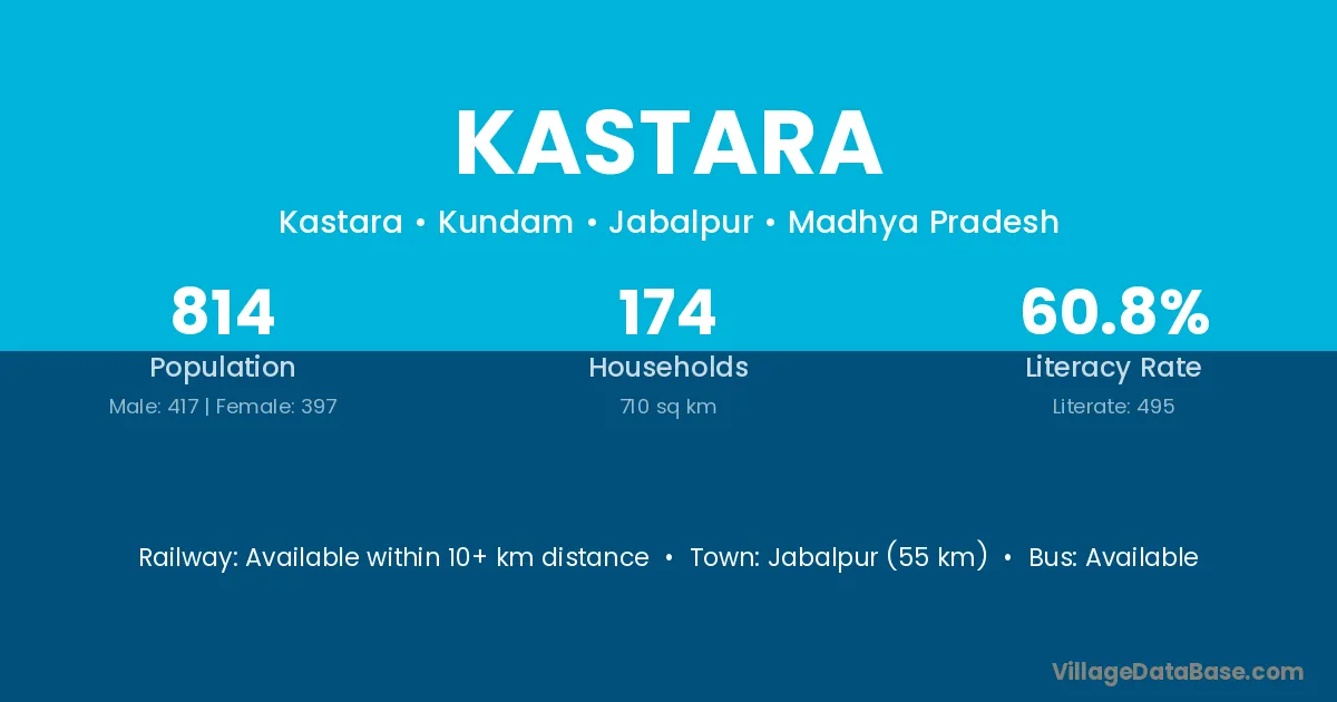 The literacy rate of Kastara village is 52.93%. Male literacy stands at 62.28% and female literacy at 42.21%.