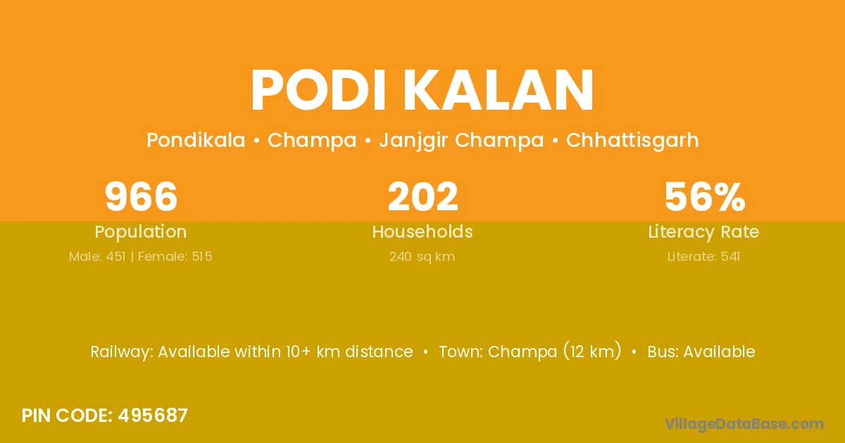 Amarpatan (28 km) is the nearest town to Podi Kalan village for major economic activities and is located approximately 28 km away.