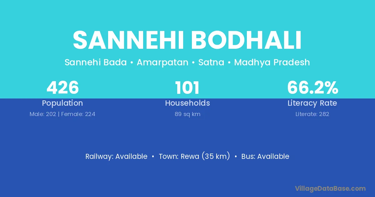 Rewa (35 km) is the nearest town to Sannehi Bodhali village for major economic activities and is located approximately 35 km away.
