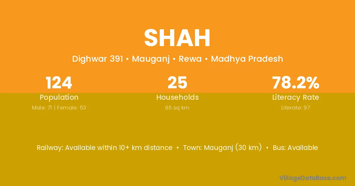 Rewa (17 km) is the nearest town to Shah village for major economic activities and is located approximately 17 km away.