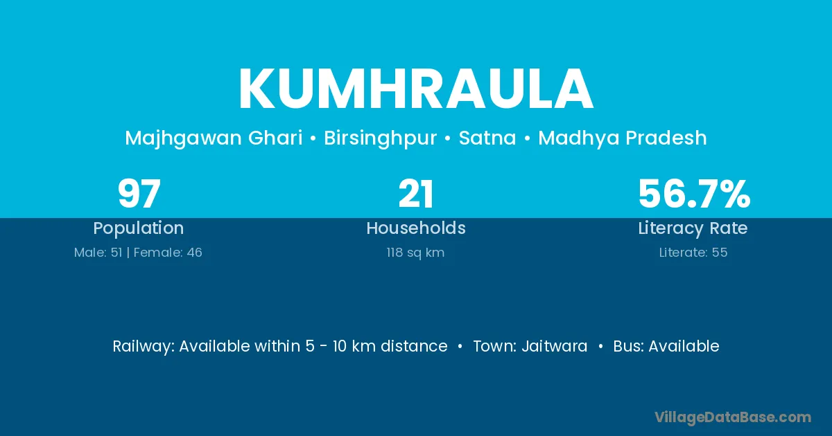 Kumhraula village has a total population of 97 people, of which 51 are males and 46 are females.