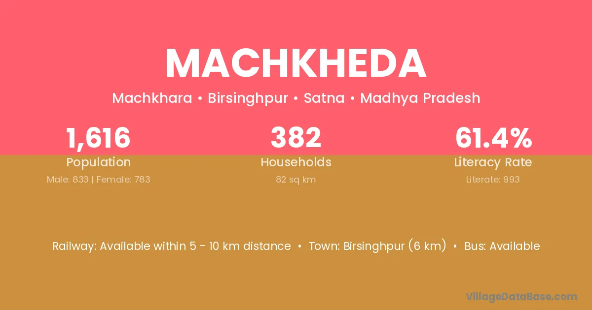 Birsinghpur (6 km) is the nearest town to Machkheda village for major economic activities and is located approximately 6 km away.
