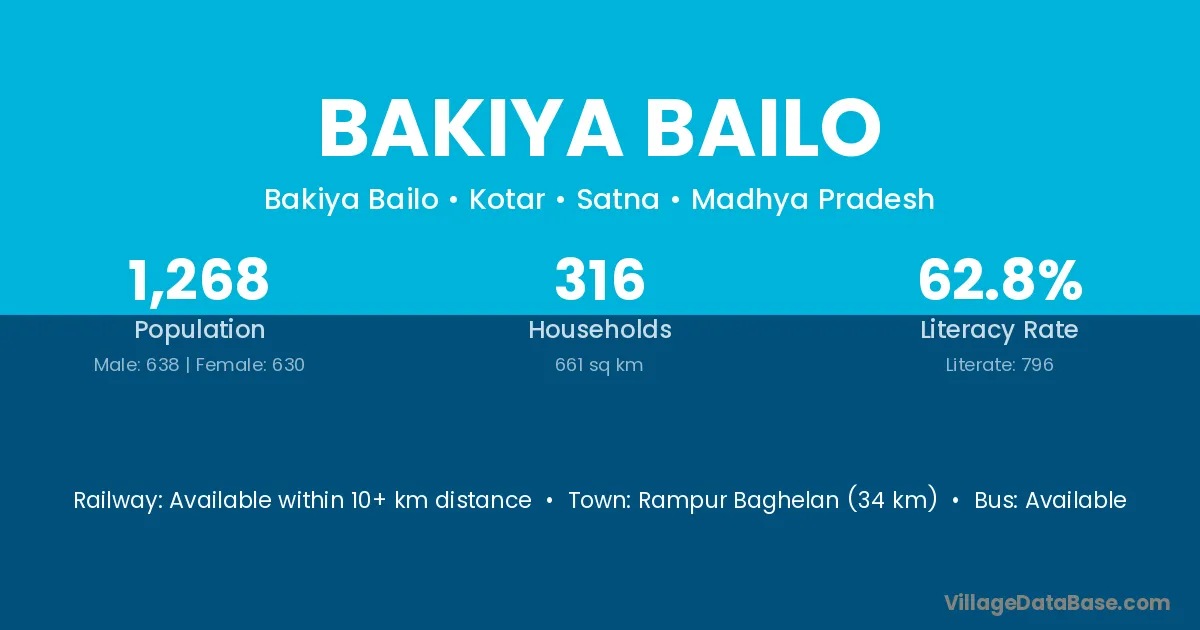 Bakiya Bailo village has a total population of 1,268 people, of which 638 are males and 630 are females.