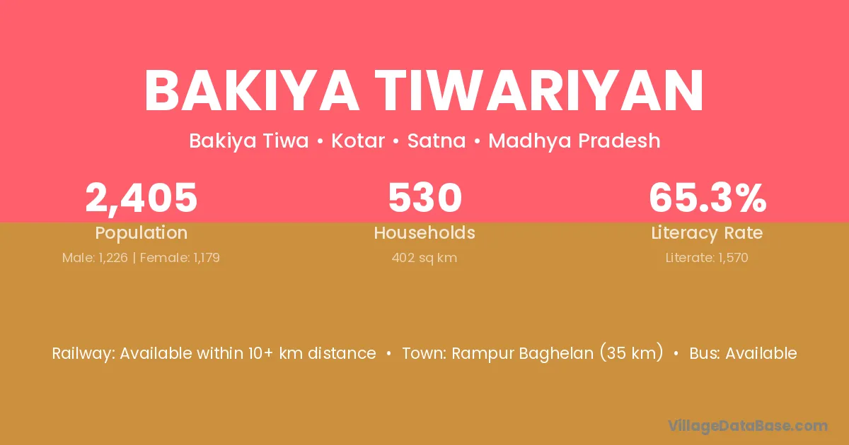 Rampur Baghelan (35 km) is the nearest town to Bakiya Tiwariyan village for major economic activities and is located approximately 35 km away.