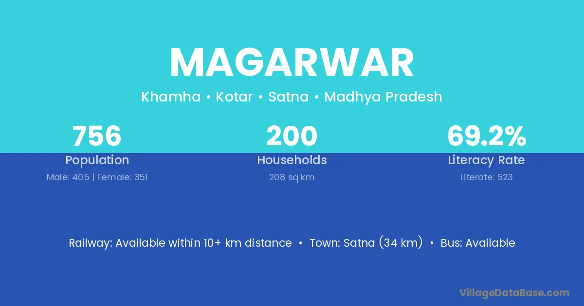 Satna (34 km) is the nearest town to Magarwar village for major economic activities and is located approximately 34 km away.