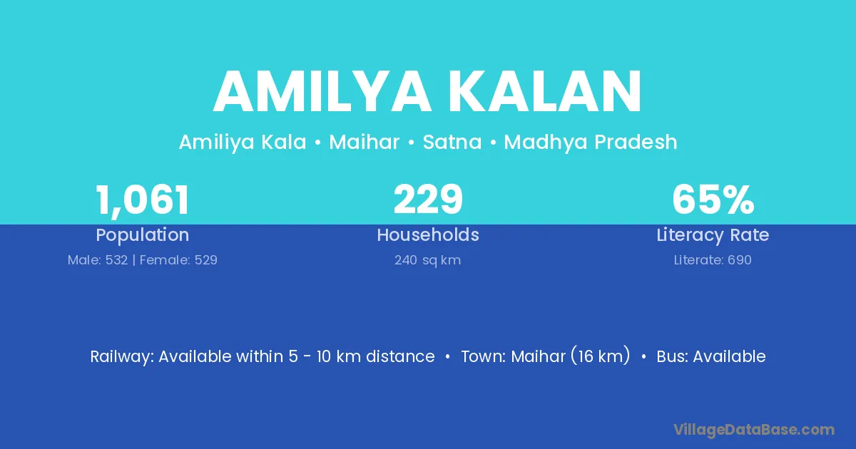 Maihar (16 km) is the nearest town to Amilya Kalan village for major economic activities and is located approximately 16 km away.