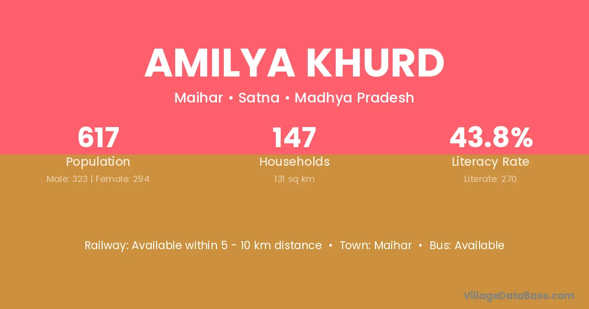 Amilya Khurd village has a total population of 617 people, of which 323 are males and 294 are females.