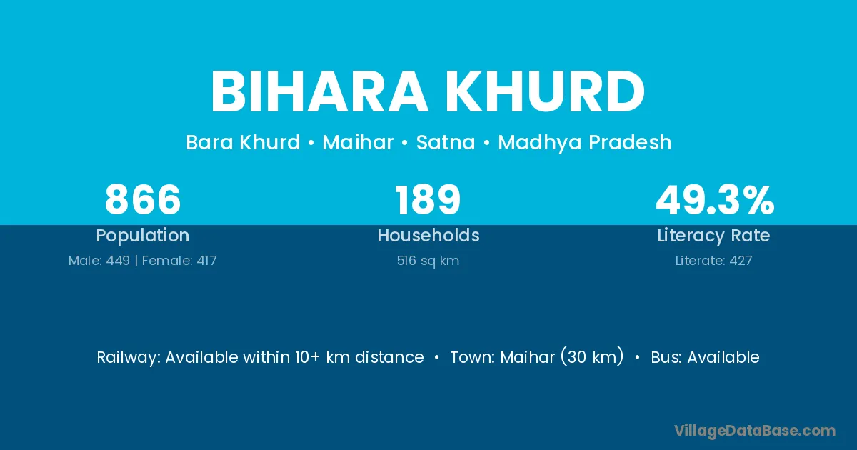 Maihar (30 km) is the nearest town to Bihara Khurd village for major economic activities and is located approximately 30 km away.