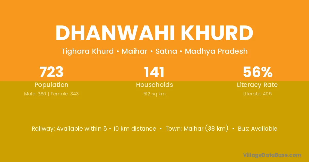 Maihar (38 km) is the nearest town to Dhanwahi Khurd village for major economic activities and is located approximately 38 km away.