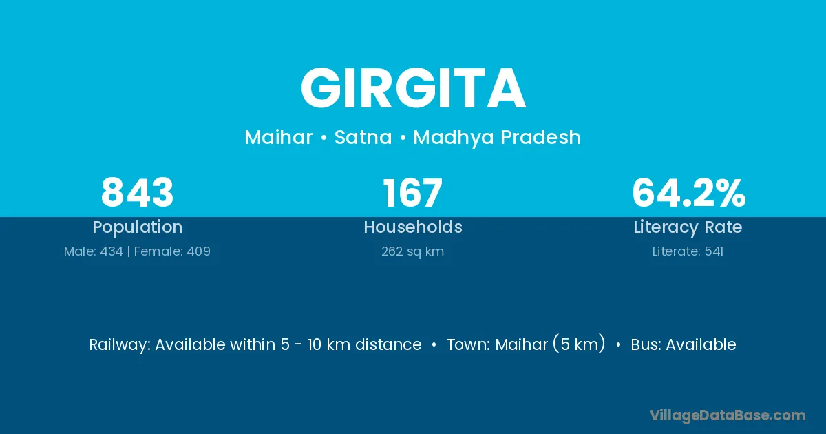 Maihar (5 km) is the nearest town to Girgita village for major economic activities and is located approximately 5 km away.