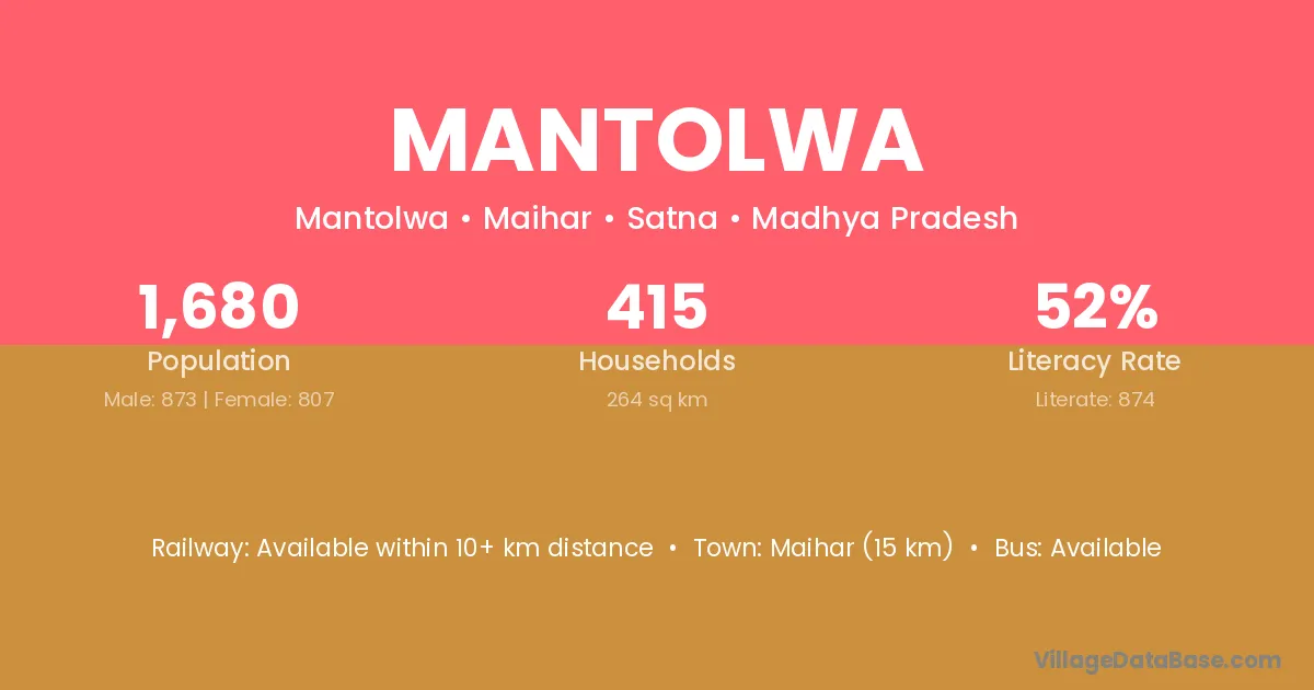 Maihar (15 km) is the nearest town to Mantolwa village for major economic activities and is located approximately 15 km away.