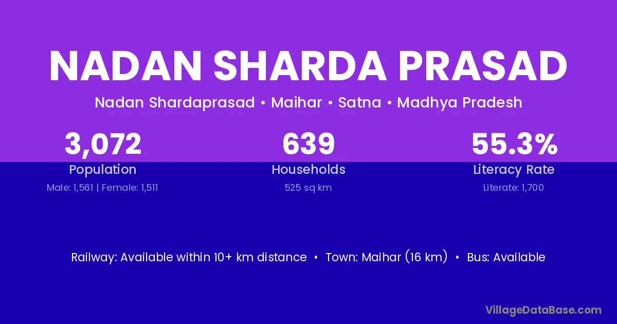 Maihar (16 km) is the nearest town to Nadan Sharda Prasad village for major economic activities and is located approximately 16 km away.