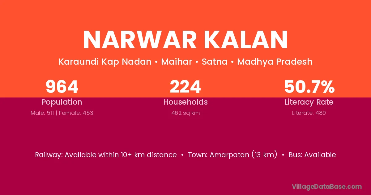 Amarpatan (13 km) is the nearest town to Narwar Kalan village for major economic activities and is located approximately 13 km away.