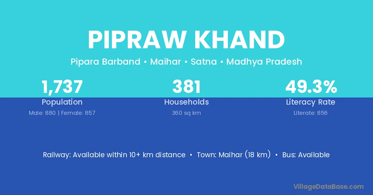 Maihar (18 km) is the nearest town to Pipraw Khand village for major economic activities and is located approximately 18 km away.