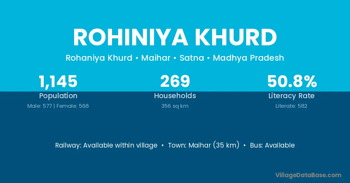 Rohiniya Khurd village has a total population of 1,145 people, of which 577 are males and 568 are females.