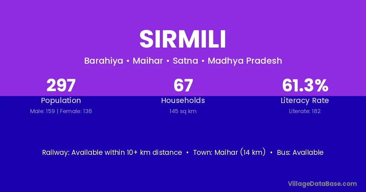 Maihar (14 km) is the nearest town to Sirmili village for major economic activities and is located approximately 14 km away.