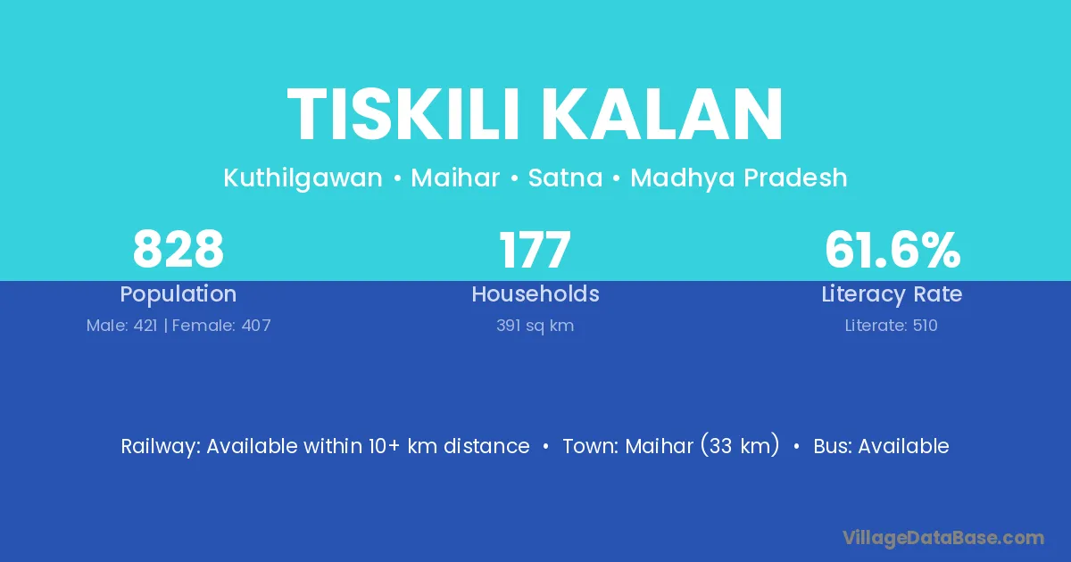 Maihar (33 km) is the nearest town to Tiskili Kalan village for major economic activities and is located approximately 33 km away.
