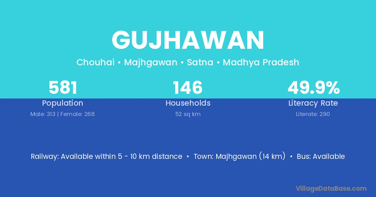 Gujhawan village has a total population of 581 people, of which 313 are males and 268 are females.