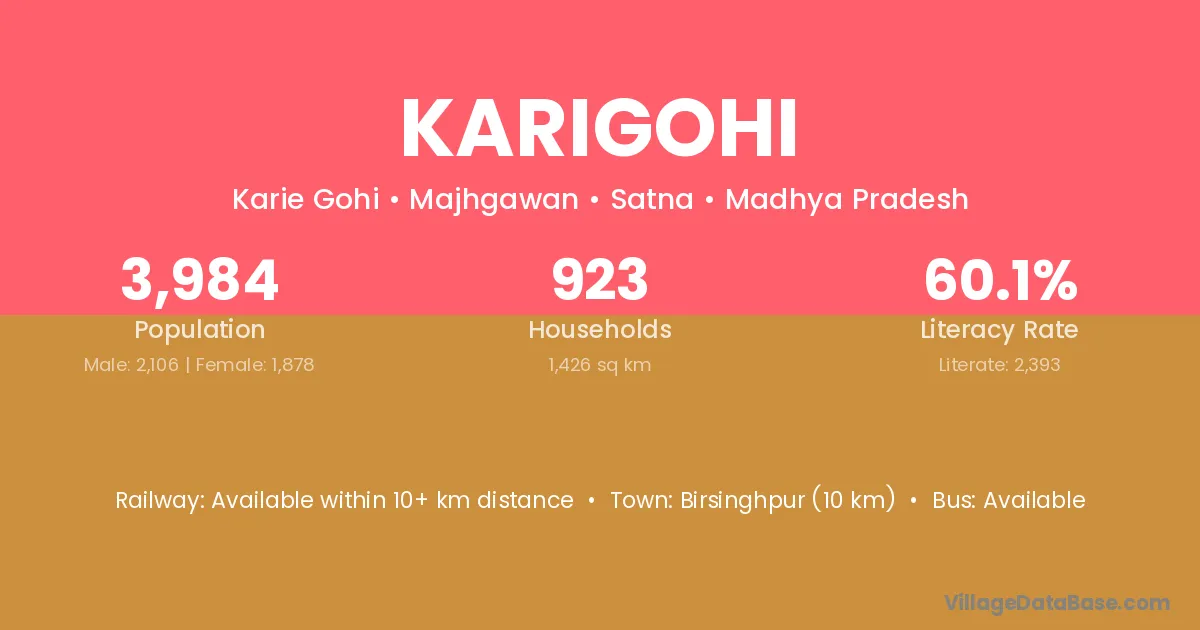Karigohi village has a total population of 3,984 people, of which 2,106 are males and 1,878 are females.