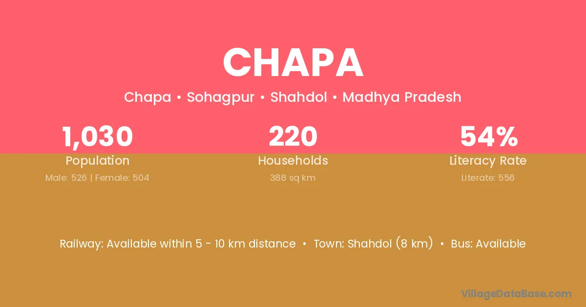 Nagod (13 km) is the nearest town to Chapa village for major economic activities and is located approximately 13 km away.