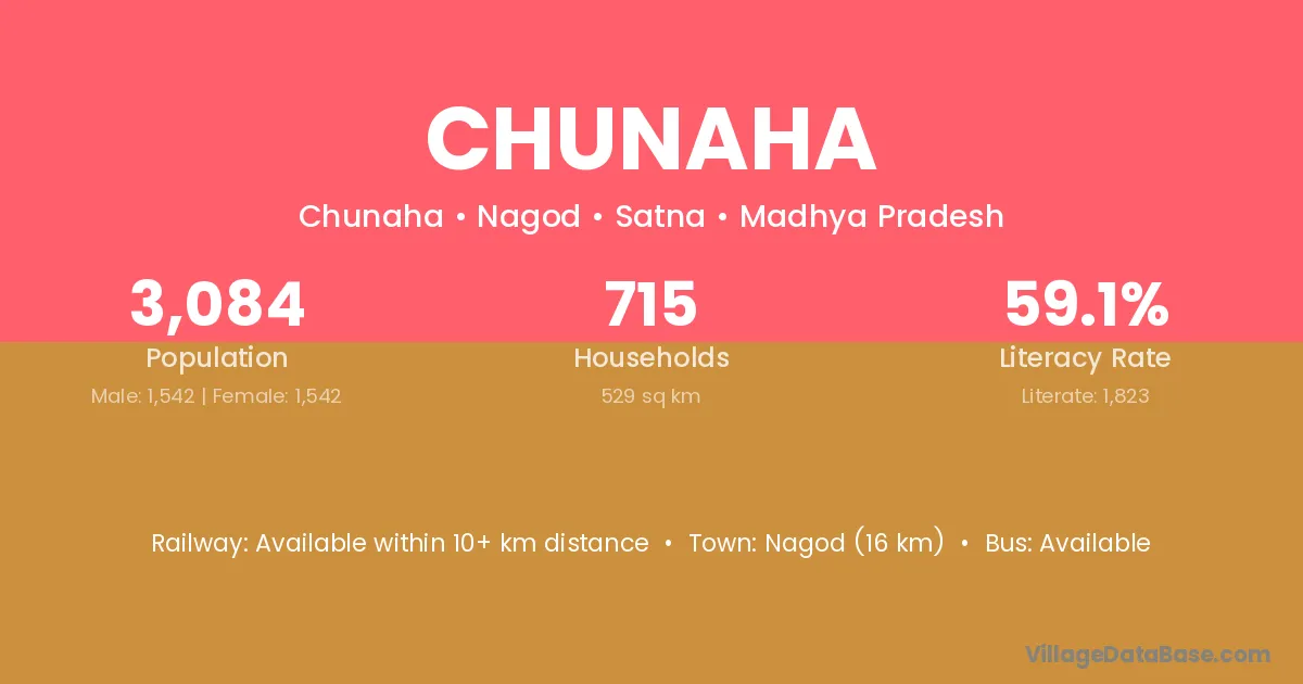 Nagod (16 km) is the nearest town to Chunaha village for major economic activities and is located approximately 16 km away.
