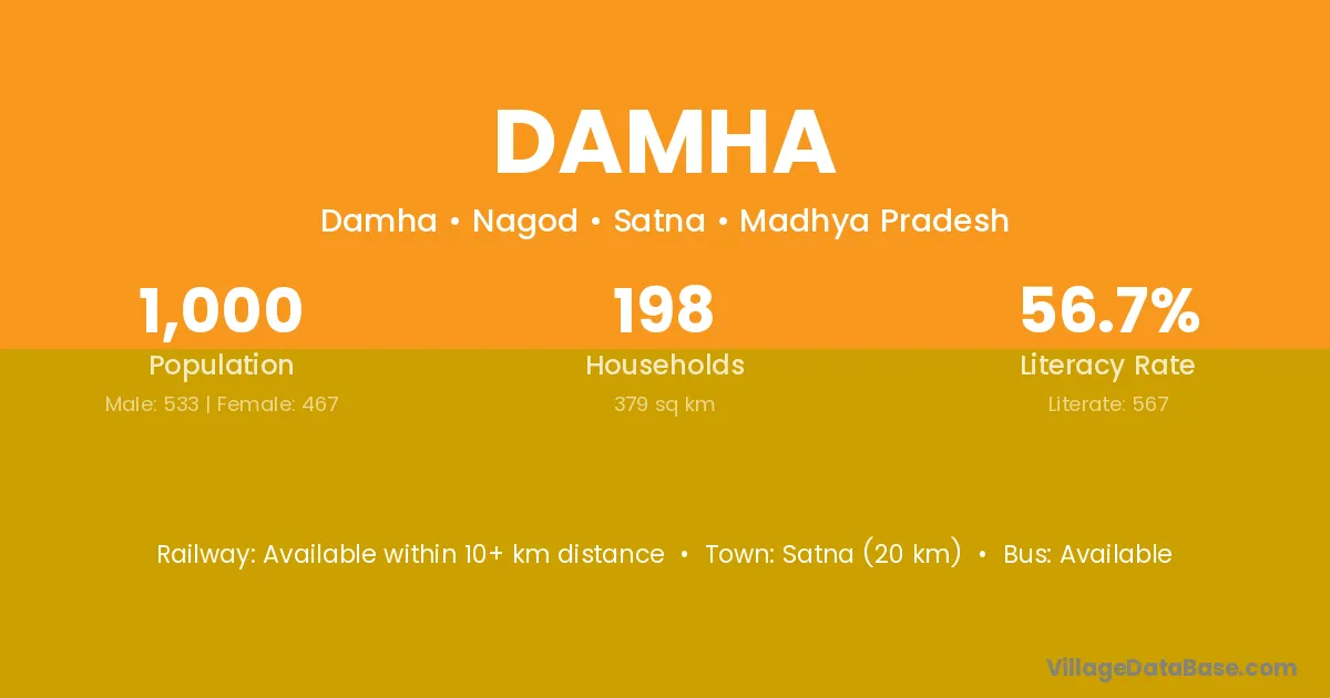 Satna (20 km) is the nearest town to Damha village for major economic activities and is located approximately 20 km away.