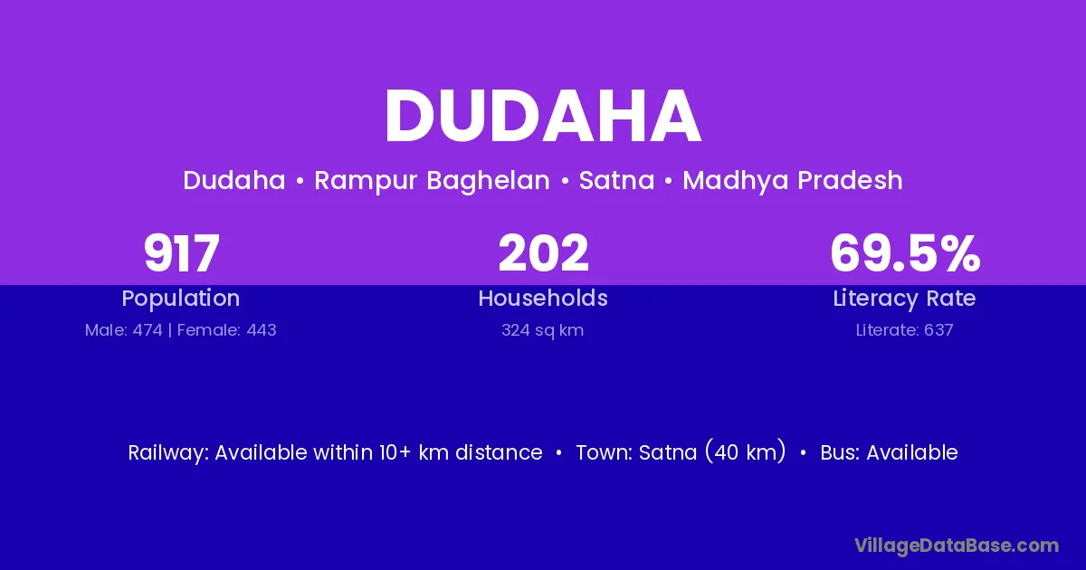 Nagod (25 km) is the nearest town to Dudaha village for major economic activities and is located approximately 25 km away.