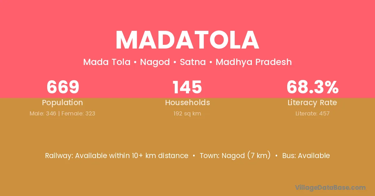 Nagod (7 km) is the nearest town to Madatola village for major economic activities and is located approximately 7 km away.