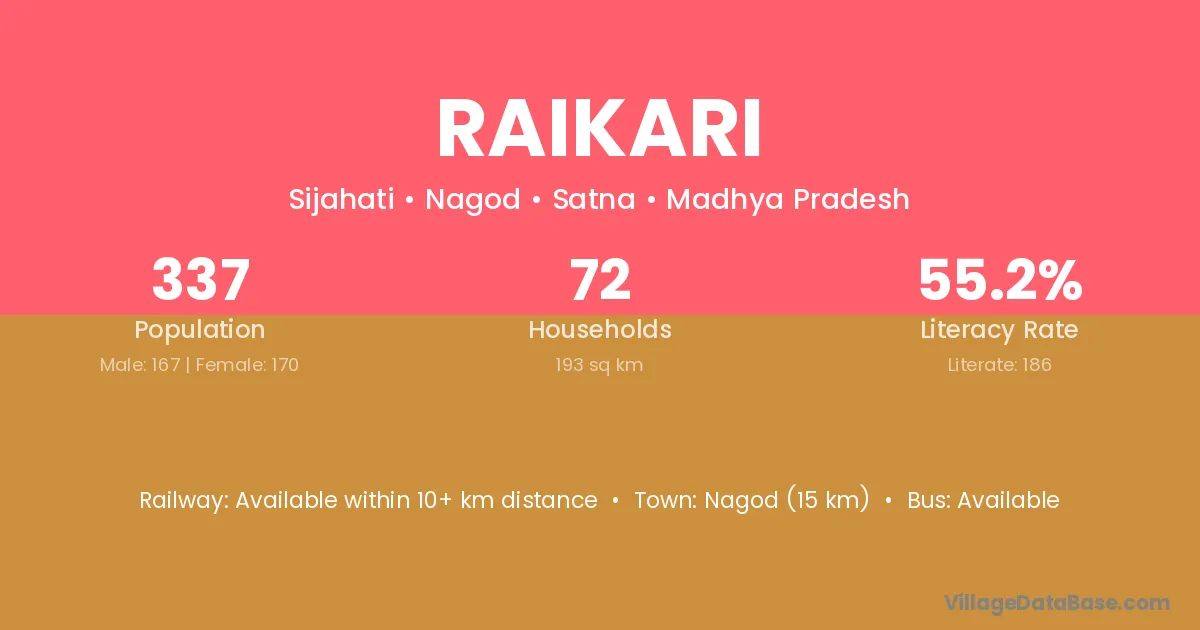 Nagod (15 km) is the nearest town to Raikari village for major economic activities and is located approximately 15 km away.