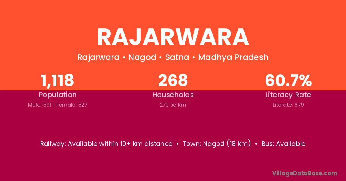 Nagod (18 km) is the nearest town to Rajarwara village for major economic activities and is located approximately 18 km away.