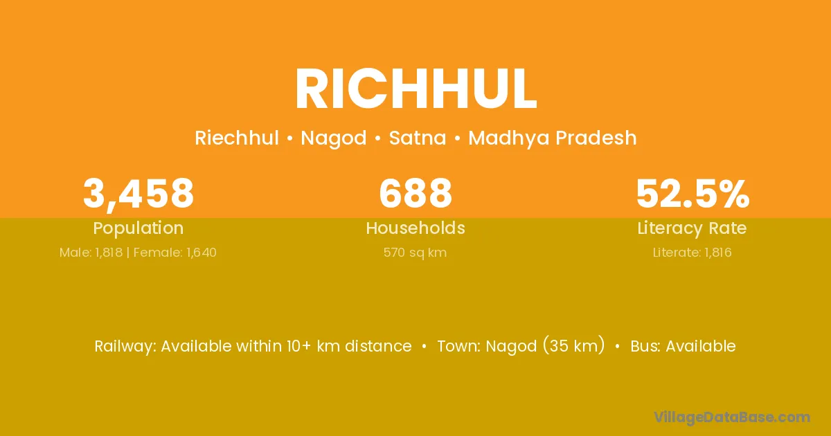 Nagod (35 km) is the nearest town to Richhul village for major economic activities and is located approximately 35 km away.