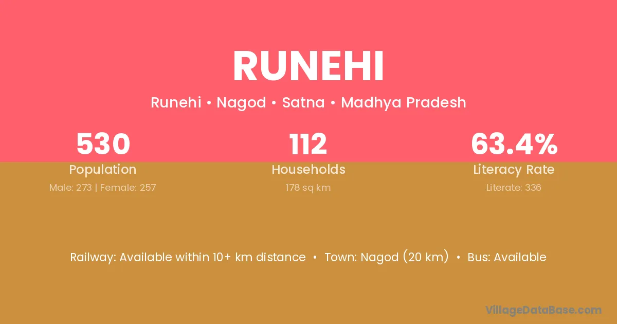 Runehi village has a total population of 530 people, of which 273 are males and 257 are females.
